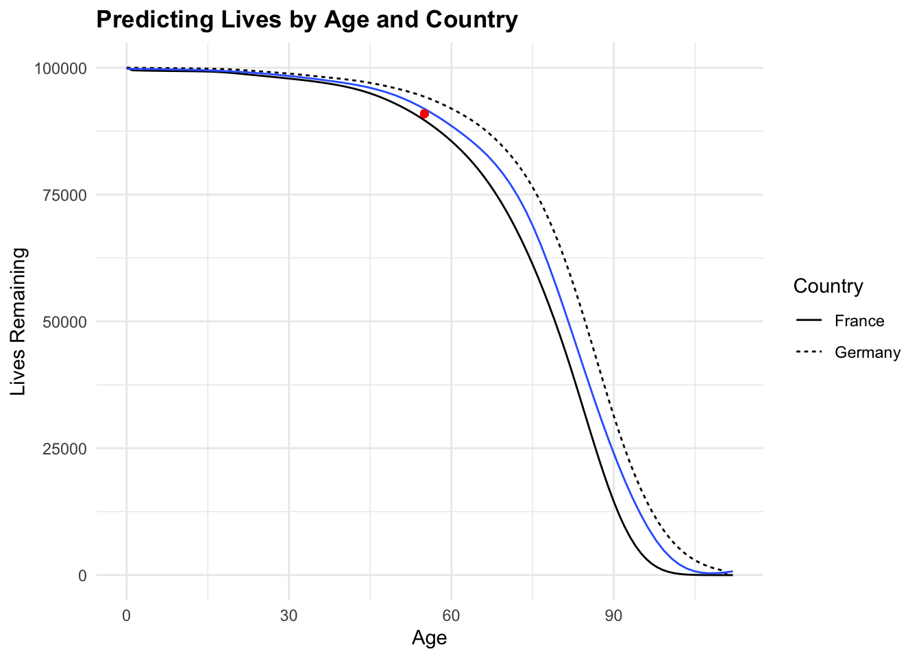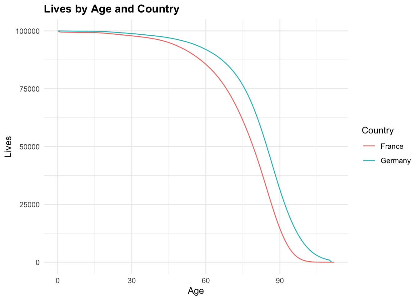Looking at the meaning of the model output, the coefficients represent the expected count of lives. The coefficient for Germany (5455.4) indicates that the expected count of lives in Germany is higher than in France, after controlling for age.