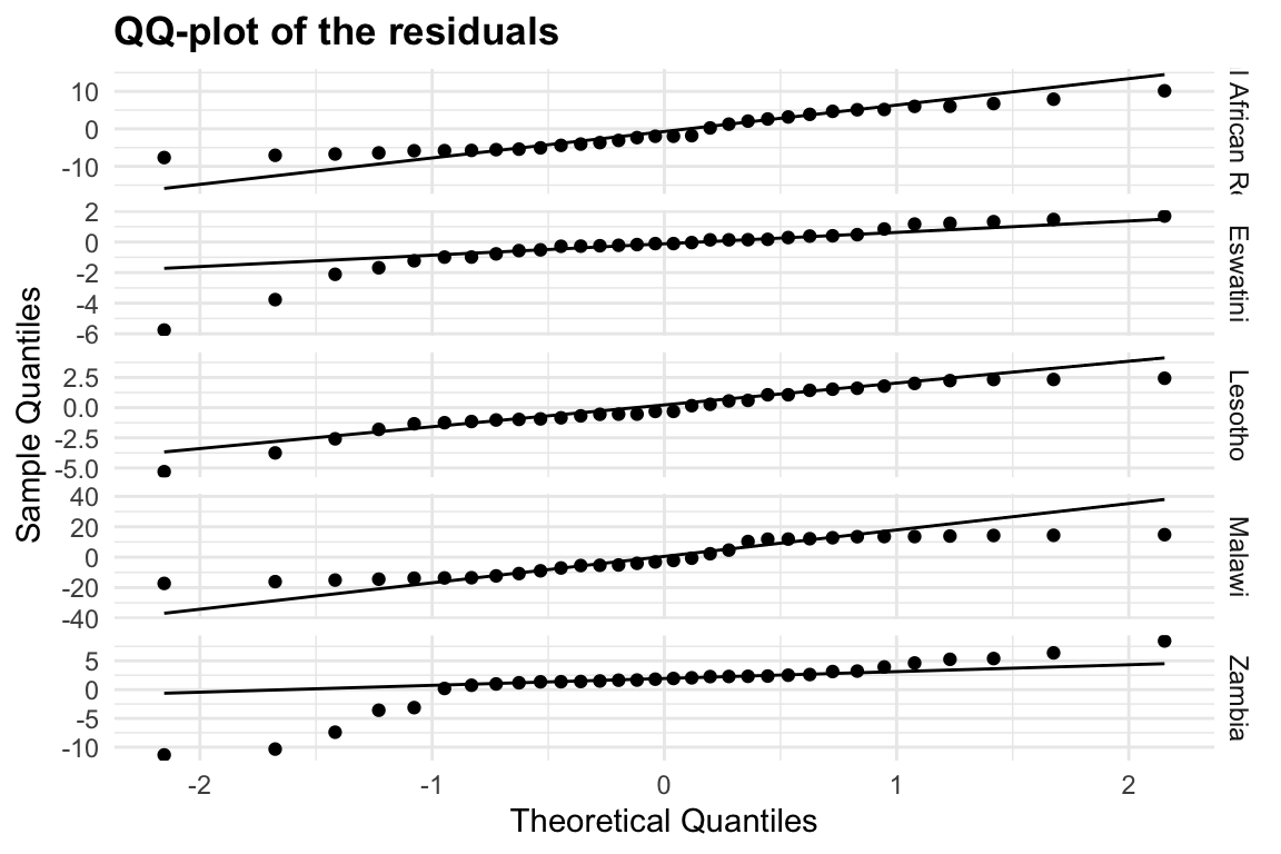 To gain an idea of the estimated average of death rates in the population, we can fit a simple linear regression model with lm() function, with the formula deaths ~ 1, which means that we are fitting a model with only an intercept (i.e., no predictors). Then we draw a simple Q-Q plot2 (a scatterplot created by plotting two sets of quantiles against one another) to check the normality of the residuals.